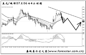 美元兌瑞郎的盤整走勢已經(jīng)持續(xù)了一個月的時間。從大級別圖形上看,下降趨勢線和均線系統(tǒng)的壓制作用仍非常完好,反彈阻力重重。短線匯價考驗圖中的下降趨勢線,即使能夠升破,道氏高點(diǎn)的阻力0.8940也將發(fā)揮強(qiáng)勁的作用?紤]到瑞郎前一段時間的持續(xù)強(qiáng)勢,目前做多美元兌瑞郎仍需謹(jǐn)慎。
