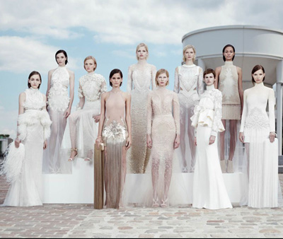 Givenchy高級(jí)定制系列經(jīng)歷了上一季的亞洲風(fēng)潮后,這次變成了白色與裸色為主的歐式風(fēng)格?赡苁沁@一年有太多的“世紀(jì)婚禮”,給予了設(shè)計(jì)師Riccardo