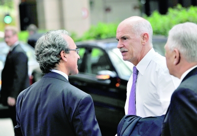 7月21日,在比利時首都布魯塞爾,希臘總理帕潘德里歐(中)抵達歐洲理事會大樓。當(dāng)日,歐元區(qū)特別峰會在布魯塞爾舉行。