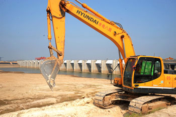 湘江長(zhǎng)沙綜合樞紐右汊閘壩完成混凝土澆筑工程。7月28日,工程車輛在湘江長(zhǎng)沙綜合樞紐工程施工現(xiàn)場(chǎng)作業(yè)。新華社記者 龍弘濤 攝 |