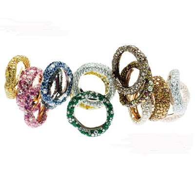 甜甜圈系列,有著非?蓯鄣拿Q,也有讓人看了會(huì)心一笑的愉悅樣貌。這些迷你鉆石甜甜圈戒指,每一個(gè)都有不同的型態(tài)與曲線,第一款是全面鑲滿白鉆的糖霜甜甜圈,也有鑲嵌彩色鉆石、藍(lán)寶石、玫瑰榴石的各種「風(fēng)情」問世?此坪唵蔚膯苇h(huán)戒指,在設(shè)計(jì)師親手蠟雕下形塑出立體弧度與層次感,所一貫堅(jiān)持的360度全面鑲嵌鑲鉆法,讓每個(gè)戒指可以有多重配戴方式,并擁有多變的搭配性。