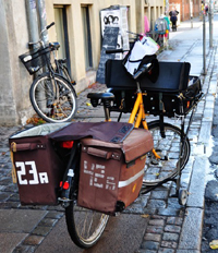 丹麥政府為了鼓勵(lì)人民騎車(chē)出行,也算是想盡了各種辦法?纯聪旅孢@輛自行車(chē)是干啥用的(圖3)?這樣的改造,也算獨(dú)具匠心了吧。其實(shí)這是郵遞員騎的自行車(chē),為支撐前面的大箱子,還專(zhuān)門(mén)設(shè)計(jì)了小輪子(見(jiàn)下圖)。