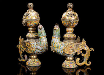 參加“賭賣”的藏品——清銅胎掐絲琺瑯鳳鳥座香薰(一對)。資料照片 |
