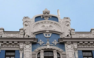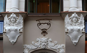 阿爾伯特街、斯特拉涅庫街和伊麗莎白大街是新藝術(shù)建筑最集中的區(qū)域。我們來到阿爾伯特街轉(zhuǎn)角處的一所建筑,拍攝整個公寓大樓必須要在路口的另一側(cè),因為街道很狹小,每次試圖拍攝這些建筑全景都不容易。沿著Kronvalda bulvaris街走到盡頭,一一經(jīng)過那些古老華麗建筑,它們的外立面非常有特色,裝飾性的浮雕石像,從武士、女神、半人半獸、各種動物、植物,甚至斯芬克斯,還有面具都可以堂而皇之地出現(xiàn)在建筑的某個部分,讓人吃驚不已。可以說里加這一風(fēng)格的建筑幾乎代表了全世界新藝術(shù)派風(fēng)格的最高成就。