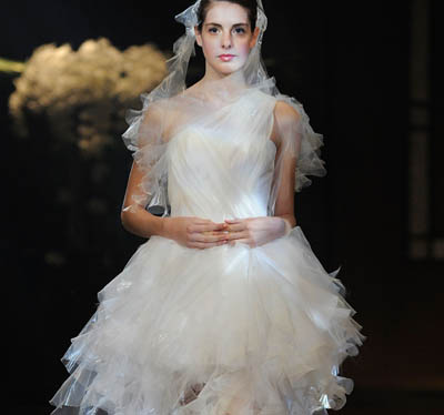 在日本首都東京的一場時裝展上,一名模特展示日本設(shè)計師松居惠里的作品。松居注重藝術(shù)和科技結(jié)合,曾于2009年帶領(lǐng)宇航服設(shè)計隊伍設(shè)計出零重力婚紗。