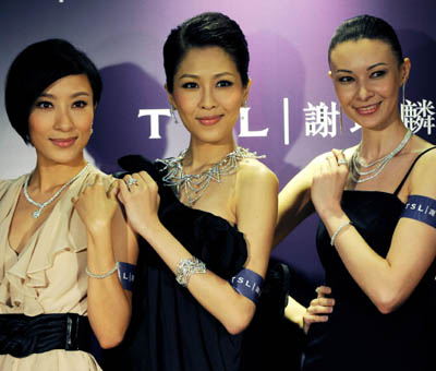 眾模特在香港旺角展示謝瑞麟珠寶集團(tuán)的皇牌系列——Estrella美鉆,該系列美鉆為100瓣獨(dú)特切割面,并呈現(xiàn)“9心1花”圖案,璀璨耀眼,獨(dú)具魅力。