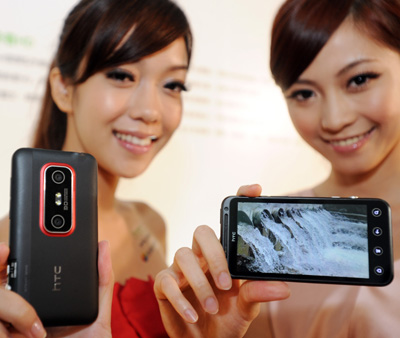 HTC(宏達(dá)國際電子股份有限公司)與臺(tái)灣大哥大在臺(tái)北聯(lián)合發(fā)布首款裸視3D手機(jī)HTC EVO 3D,讓消費(fèi)者感受震撼的裸視3D效果。圖為模特在展示HTC首款裸視3D手機(jī)。