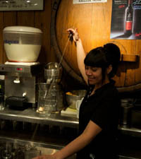 女招待身后那個(gè)巨大的橡木桶,里面盛著蘋果酒,蘋果酒并不像葡萄酒那樣會(huì)緩緩流出。由于酒桶內(nèi)的壓強(qiáng)較大,蘋果酒都是噴出來的,因此這要求招待一定要用杯子很準(zhǔn)的接在酒噴射到的地方。