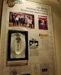 在整個(gè)進(jìn)食過程中,我一邊忙著吃,一邊也沒有讓手中相機(jī)停下來。看,照片上是一款很典型的西班牙土豆餅。而在Vitoria人的手下,它看起來又像法國蛋餅,加生菜,還加上了蟹肉。我不得不說,這是我吃過的最好吃的西班牙土豆餅。還有那沙丁魚,金槍魚,雞蛋,蘆筍和橄欖穿成的小串串,也相當(dāng)可口。接下來我們品嘗到了藏紅花佐加里西亞章魚風(fēng)味和火腿煎青椒等等。還有蔬菜奶酪卷,這是由三種蔬菜制成的,中間卷有奶酪絲,用熱蔬菜的溫度將奶酪烤至半融化。這個(gè)塔帕斯個(gè)頭很大,但吃著有些膩。