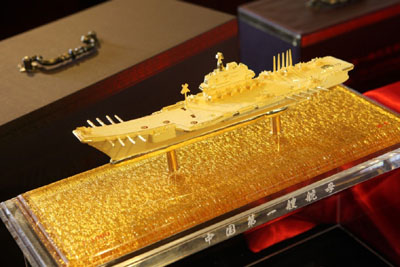為紀念中國第一艘航空母艦問世,中國人民革命軍事博物館與上海昶昱投資有限公司聯(lián)合發(fā)行中國第一艘航空母艦?zāi)P汀?jù)悉,“中國第一艘航空母艦”微縮模型以中國第一艘航空母艦為原型,純金版微縮比例1:1680,采用50克.999黃金純手工打造,全國限量發(fā)行50000套。銅鍍金版艦長304mm,艦寬70.5mm,微縮比例1:1000,限量發(fā)行80000套。每套均配有收藏證書,且有獨立編號。