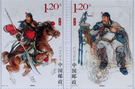 9月12日中秋佳節(jié),《關(guān)公》特種郵票在湖北荊州舉行了首發(fā)揭幕。據(jù)了解,本次中國郵政發(fā)行的關(guān)公特種郵票,1套2枚,小型張1枚,設(shè)計(jì)者是中國年輕畫家晁谷。兩枚郵票分別表現(xiàn)了橫刀立馬的“武關(guān)公”和夜讀春秋的“文關(guān)公”形象,小型張則表現(xiàn)了關(guān)帝廟背景下威風(fēng)凜凜的關(guān)公立像,突出了關(guān)公“神”的形象。