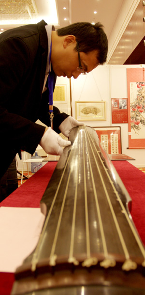 圖為競拍者在欣賞元代朱致遠制作的“龍吟”款仲尼式古琴。