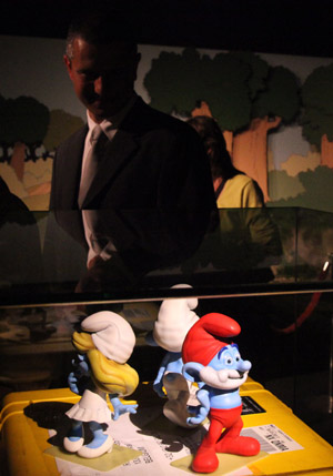 9月28日,參觀者在新落成的比利時(shí)首都布魯塞爾漫畫塑像博物館欣賞“藍(lán)精靈”。