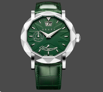 腕表亦貫徹GRAFF高級腕表的特色,在12時位置鑲有一顆三角形切割白鉆,而紋理精致的表盤和真皮表帶,則采用品牌的經(jīng)典綠色,互相輝映。訂購GraffStar