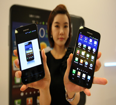 三星電子近日在韓國首爾舉行發(fā)布會,公開了配備Super AMOLED屏幕的全新LTE智能手機(jī)——“Galaxy S II LTE”和“Galaxy S II HD LTE”。圖為模特在展示新款手機(jī)。