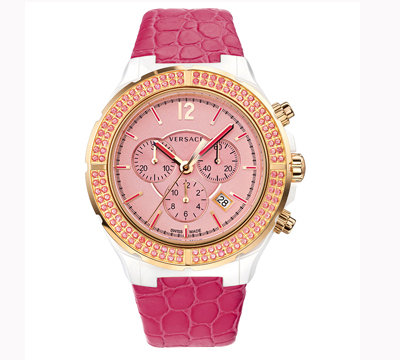 Versace設計,顯示了靈感來自Versace范思哲2011秋冬時裝秀的高科技材料以及色調(diào):藍色、紫色、黑色和紅色。亞光黑色陶瓷表殼與藍色鋁質(zhì)表圈;藍色和紫色橡膠表帶,搭配紅色琺瑯表盤。