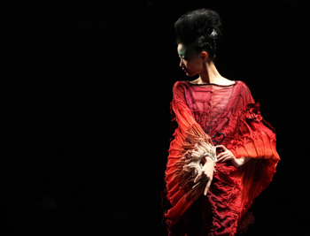 巨大的似木紋年輪又似水墨點(diǎn)染的舞臺背景前,模特身著棉麻天然材質(zhì)服裝,精致的手工細(xì)節(jié)與水墨暈染的視覺效果,充分展現(xiàn)了弄影·羅競杰2012春夏時裝發(fā)布會的主題“五行—水木”。