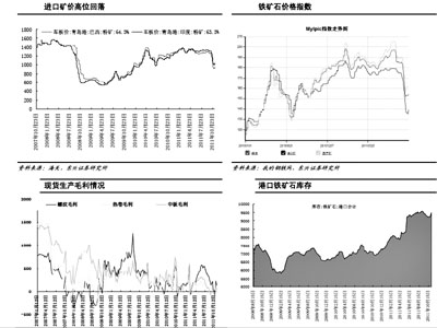 上周(截至2011年11月4日)國內(nèi)外鐵礦石價格繼續(xù)下跌,但跌幅趨緩,青島港現(xiàn)貨價格下降4.8%,唐山鐵精粉價格小幅下跌0.8%。值得注意的是,國外礦石價格在下半周出現(xiàn)回升;上周廢鋼價格維持前周水平。隨著鋼價尤其是建材價格趨穩(wěn),礦石價格跌幅趨緩,市場氣氛比前期稍有活躍,但目前多數(shù)鋼廠對鐵礦石采購依然保持謹慎態(tài)度,積極性較低。