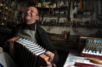 這間8平方米的小鋪子很不起眼,破舊的小店里密密匝匝地擺滿各式手風(fēng)琴。一角的墻上整齊地掛著鉗子、螺絲刀、銼刀等工具。一張桌前一位高鼻深目的中年男子端坐著,認(rèn)真地拆卸著一架剛剛送來維修的手風(fēng)琴。