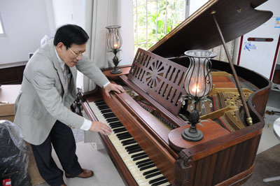 年逾六旬的館主陳恭是福建職業(yè)藝術(shù)學(xué)院的退休教師,年輕時(shí)畢業(yè)于上海音樂(lè)學(xué)院樂(lè)器制造專業(yè),他會(huì)制造樂(lè)器,尤其擅長(zhǎng)修復(fù)古董樂(lè)器。陳恭說(shuō):“我從事樂(lè)器研究、制作、維修已幾十年,積累了大量樂(lè)器制造、歷史和文化方面的知識(shí),我收藏這些樂(lè)器,就是為了要讓更多的人感受到樂(lè)器文化的美好。”圖為陳恭收藏的具有130多年歷史、純手工制造的德國(guó)漢諾威鋼琴。