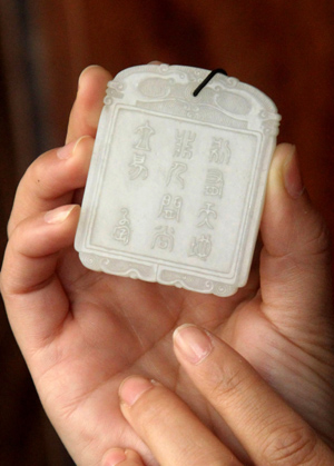 近日,“陸子岡玉雕藝術與中國玉文化研討會”在蘇州舉行。200余位學者和玉雕藝人參加了“中國玉文化發(fā)展階段與典型特征”、“東亞最古老的玉器”等玉文化主題研討。陸子岡是我國明代知名玉雕家,其現(xiàn)今傳世作品主要被收藏在故宮博物院、首都博物館等地。圖為“子岡款”詩文牌飾。