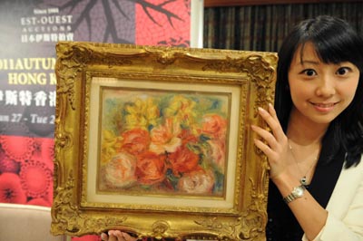 圖為模特展示皮埃爾·奧古斯特·雷諾阿的油畫《薔薇圖》(23×28cm),估價(jià)200萬至300萬港元。