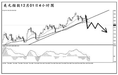 從圖中看,美元指數(shù)未能持續(xù)上行挑戰(zhàn)79.80的阻力,短線價(jià)格回落,已經(jīng)將4小時(shí)圖的上升通道下沿跌破,MACD進(jìn)入到空頭動(dòng)能充盈的階段。小時(shí)圖均線系統(tǒng)已經(jīng)轉(zhuǎn)為空頭排列,且主次節(jié)奏向下,美元指數(shù)后市繼續(xù)下跌的概率很大。短線需首先關(guān)注道氏低點(diǎn)77.50的支撐作用。