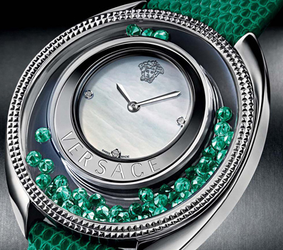 整整兩克拉的祖母綠寶石環(huán)繞著引人注目的白色珍珠貝母表盤,表盤十二點(diǎn)位置刻有Versace(范思哲)著名的Medusa美杜莎女神頭像,時(shí)標(biāo)上鑲嵌有鉆石,這是一款引人入勝的驚艷之作。漂亮的不銹鋼表殼外圈以巴黎飾釘裝飾,搭配以與漂浮的祖母綠寶石顏色相一致的綠色蜥蜴皮表帶,更顯腕表的珍貴。