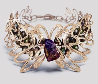 “Sea Duchess”項(xiàng)鏈?zhǔn)荓arry Jewelry最新系列“Sea of Colours”中的經(jīng)典之作,靈感來自傳說中珍奇靈動的海洋生物蛟龍,其設(shè)計不但展現(xiàn)出新穎婉約的動人線條,正中更鑲嵌珍貴罕見的50.73克拉雙色紫黃晶寶石,伴以24顆南洋黑珍珠、216顆約7.46克拉的啡鉆及500顆約4.32克拉的白鉆。