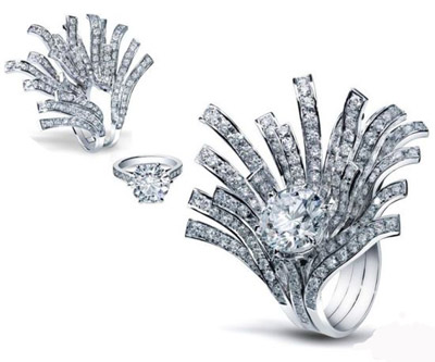 “Tasurri”戒指洋溢超凡的豪門氣派,是出席盛會的首選鉆飾,綴滿鉆石的條子如彩帶般向上飛揚,中央躺著一顆偌大的5卡美鉆,足以閃耀全場。想要在平日配戴時展現(xiàn)得較低調(diào)而不失奢華,只需把彩帶部份拆除,變成單顆鉆石戒指,絕對是配襯套裝或休閑服的理想配飾。