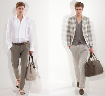 從Fendi近日釋出的2012春夏男裝圖冊(cè)可見,在全新一季的發(fā)售款式上,褲款以九分褲為新趨勢(shì),搭配開襟衫、襯衫與西裝等各種風(fēng)格,可正式也可休閑的多樣穿搭。一向以定制時(shí)裝見長的奢華品牌Fendi,本季男裝以輕松的粉色系搭配丹寧與卡其色系,勾勒出全新的Fendi風(fēng)格。 同時(shí),本次大片由Karl Lagerfeld掌鏡,老佛爺以“靈魂出竅”的趣味手法表現(xiàn)出Fendi的全新時(shí)裝世界。