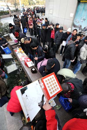 1月5日,購買《壬辰年》特種郵票的市民在南京鼓樓郵政大廈外排起數(shù)百米長隊(duì),一些郵迷在展示剛剛買到的《壬辰年》特種郵票和郵品,供大家觀賞交流。