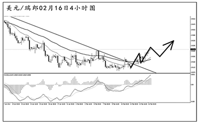 美元兌瑞郎升破了下降壓力線之后持續(xù)上揚(yáng),目前匯價(jià)正在考驗(yàn)0.9260的道氏高點(diǎn)阻力,4小時(shí)圖MACD多頭動能充盈。從日線圖上看,若匯價(jià)重新升破均線系統(tǒng)的壓制,后市仍有機(jī)會繼續(xù)沖擊前高0.9595一線的阻力。短線等待調(diào)整節(jié)奏出現(xiàn)后可繼續(xù)做多。