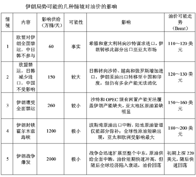 此外,對于伊朗局勢可能的幾種情境,我們做出以下歸類(見下表)。其中情境1、2和3之間的跨度較大,而在情境3下,伊朗遭受全面制裁后到情境4和5的演變將會較為迅速。一旦伊朗爆發(fā)戰(zhàn)事,將會引發(fā)中東原油生產(chǎn)的全面停滯。從目前事態(tài)的發(fā)展來看,仍處于情境1的預(yù)期之下,我們預(yù)計在7月歐洲正式對伊朗實施禁運之后,有可能發(fā)展為情境2,而發(fā)展至情境3的可能性極小。因此,就伊朗局勢的影響而言,我們預(yù)計,在一季度、二季度偏中性,而在三季度之后將對油價產(chǎn)生一定推動。