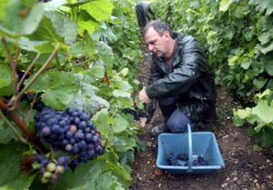 圖為在法國(guó)香檳地區(qū)的一個(gè)葡萄園里,農(nóng)民在采摘。新華社/法新 |