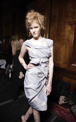 雖然以灰、藍(lán)、紫、駝色為主色調(diào)的本季時裝與韋斯特伍德過去的設(shè)計相比較為暗沉,但與原生態(tài)的民族風(fēng)格圖案搭配起來更顯自然。不甘寂寞的韋斯特伍德還在其中穿插了飽滿的橙色針織衫、絲巾和酒紅色連褲襪,為寒冷的秋冬季節(jié)帶來一絲暖意。
