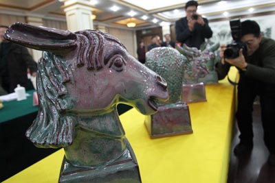 日前,中國(guó)鈞瓷十二獸首新聞發(fā)布暨作品研討會(huì)在河南許昌市舉行。據(jù)悉,中國(guó)鈞瓷十二獸首鐫刻圓明園標(biāo)志,經(jīng)圓明園管理處授權(quán)制作、監(jiān)制,限量制作151套,編號(hào)從1860到2011,紀(jì)念自1860年英法聯(lián)軍火燒圓明園到2011年的151年歷史。編號(hào)1860的作品由圓明園管理處永久收藏。 圖為中國(guó)鈞瓷十二獸首在河南許昌迎賓館亮相。新華社發(fā)