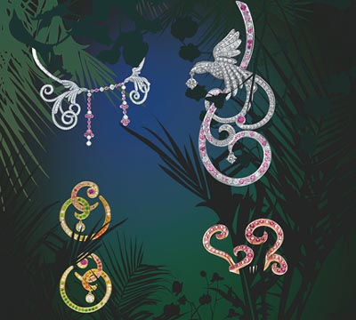 珍愛之鳥”系列珠寶。 修長的線條、豐滿的羽毛、細致復(fù)雜的卷曲花紋、令人目炫的罕貴彩色寶石,讓神話幻化成浪漫永恒,在強烈的動感中展現(xiàn)Van Cleef