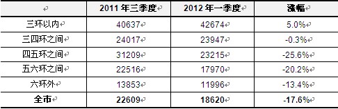 更重要的是,全市房價(jià)已經(jīng)出現(xiàn)實(shí)質(zhì)性下調(diào),由于過去一年來各項(xiàng)目累計(jì)的庫存量較高,部分項(xiàng)目已經(jīng)開始加大折扣幅度,這是房價(jià)下調(diào)的基礎(chǔ),各環(huán)線價(jià)格普遍下降便是最好的說明:偉業(yè)我愛我家統(tǒng)計(jì)數(shù)據(jù)顯示,與2011年三季度相比,2012年一季度三四環(huán)之間均價(jià)僅下降0.3%,三環(huán)以內(nèi)房價(jià)還上漲5%,為全市價(jià)格相對(duì)穩(wěn)定的區(qū)域;除此之外,其他區(qū)域房價(jià)均出現(xiàn)明顯下降,其中四五環(huán)之間、五六環(huán)之間均價(jià)分別下降25.6%、-20.2%,為全市下降幅度最大的區(qū)域。