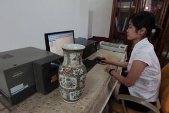工作人員在用脫;Y(jié)構(gòu)分析法對(duì)瓷器的年代進(jìn)行數(shù)據(jù)分析。“脫;蓖ㄟ^對(duì)瓷器釉面微觀物質(zhì)結(jié)構(gòu)的測(cè)試可以確定釉質(zhì)結(jié)構(gòu)變化的程度、推測(cè)釉質(zhì)最后燒成的年代,以此來判斷器物的年代。記者