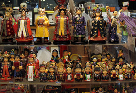 到仁寺洞旅游的外國游客,一定會被這里遍布各處的文化商品所吸引,就連已經(jīng)去過無數(shù)次的我,面對各種精致可愛的工藝品,也常常流連忘返。仁寺洞最受歡迎的商品要數(shù)陶器,英國伊麗莎白女王曾經(jīng)訪問過這里的“樸英淑窯”。改良的生活韓服也在仁寺洞大行其道,美麗精致的設(shè)計總令女顧客們愛不釋手。除此以外,物美價廉的韓國傳統(tǒng)生活用品也極受歡迎,漂亮的綢緞荷包、扇子和韓國結(jié)手機(jī)鏈等都是送禮佳品。熱愛古籍的朋友們,則在彌漫著書香的古籍一條街里久久駐足。