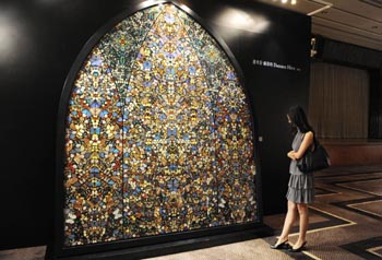 2009年10月7日,韓國(guó)首爾拍賣(mài)行現(xiàn)代及當(dāng)代藝術(shù)香港秋季拍賣(mài)會(huì)上,英國(guó)藝術(shù)家達(dá)明·赫斯特采用蝴蝶與家用光亮顏料創(chuàng)作的《他方的重要——天堂國(guó)度》,以1722.2萬(wàn)港元成交,創(chuàng)下當(dāng)時(shí)赫斯特作品在亞洲拍賣(mài)的最高成交紀(jì)錄。圖為觀(guān)眾在預(yù)展上欣賞赫斯特的該幅作品。記者 宋振平/攝 |