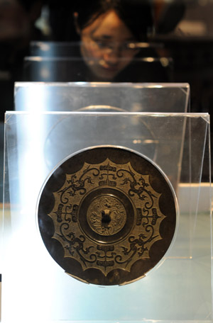圖為一名女子在展出的戰(zhàn)國(guó)時(shí)期的花葉龍紋鏡附近參觀(guān)。