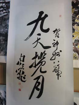 在“神舟九號”運(yùn)抵酒泉之際,4月7日,由當(dāng)代青年書法家、毛體書法傳承人周鵬飛手書、被“神舟八號”搭載的《九天攬?jiān)隆访w書法作品在“神舟八號”飛船成功返回地面后,在周鵬飛的個人書畫展上首次呈現(xiàn)在觀眾面前,引起了社會各界人士對航天事業(yè)的極大關(guān)注。前來欣賞的觀眾不僅目睹了“神八”帶回的珍貴墨跡,還觀賞到了由其大寫意的18張丈二巨幅畫組成的《九州頌和諧》。