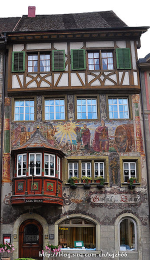 確切地說,施泰因不能叫做城市,充其量是個小鎮(zhèn),這里的常住人口只有3000人。從面積上看,小鎮(zhèn)長400多米、寬只有200多米,很小的范圍,但濃縮的的確都是精華。街巷里,到處是中世紀的老建筑,每家每戶的窗口,都擺放著五顏六色的鮮花。最令人目不暇接的,是建筑外立面上的濕壁畫(Fresco),雖然這些壁畫大部分產(chǎn)生于上世紀初。