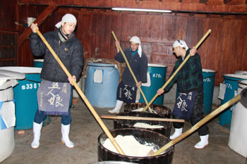 工作人員手持的長竹竿前固定有一塊厚木塊,這就是攪拌的工具。而制作酒母的最大看點(diǎn)就是工作人員一邊攪拌一邊唱《釀酒歌》。歌曲長達(dá)13段,“利根川水源流長,清泉涌出釀瓊漿……”吉慶的歌詞讓煩躁單調(diào)的工作充滿樂趣,還有一個功效是可以用歌曲來估算攪拌的時間,真正將勞動與藝術(shù)結(jié)合在一起。隨著不斷攪拌,大木盆內(nèi)的蒸米飯、酒曲結(jié)合在一起,變成了黏糊狀。