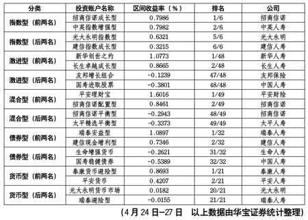 華寶證券統(tǒng)計,4月24日-4月27日,大部分投連險賬戶延續(xù)上揚趨勢,整體取得0.33%的平均收益,其中91.7%的賬戶實現正收益。但仍有國壽進取股票、友邦增長組合等多個賬戶以區(qū)間負收益的表現在各類型投連險賬戶中墊底。