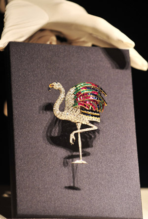 圖為工作人員在臺(tái)北故宮博物院圖書文獻(xiàn)大樓開箱展示20世紀(jì)英國溫莎公爵夫人佩戴過的“火鶴胸針”。新華社發(fā)