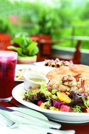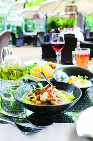 闌棠在藍(lán)色港灣的酒吧街一側(cè),二樓的露臺是好多人醉心的地兒,露臺天擦黑的時候感覺最棒,旁邊是微微泛濫的湖水,身后是歐洲風(fēng)情的建筑,還真有一點置身于海邊某家餐廳的錯覺。闌棠是泰餐廳,菜品方面推薦這里的香濃咖喱虎皮大蝦(120元),大個兒的開背虎皮蝦烹炸后配上泰式紅咖喱,味道鮮香勁辣、很過癮,喜歡紅咖喱的話,另外推薦一道紅咖喱牛肉(70元)味道也不錯,切成片狀的牛肉十分入味,同樣香辣。其他如鮮辣海鮮粉絲沙拉(50元)、冬陰功(75元)等都是不必多說的招牌菜式,水準(zhǔn)不錯。酒水方面推薦一道闌堂鮮果雞尾酒(50元),酒里有很多水果碎,入口香甜,酒味不濃。