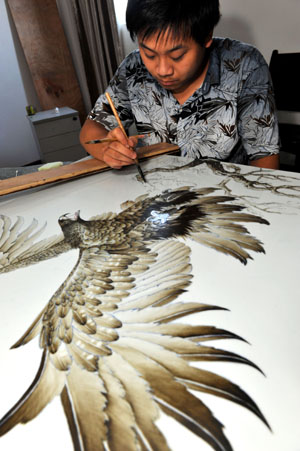 圖為方球正在創(chuàng)作釉上粉彩《大展宏圖》,他的作品繼承了現(xiàn)代與傳統(tǒng)的藝術風格,構圖新穎,色彩明快。